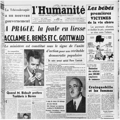 'The Communist Coup in Prague, from 'L'Humanite', 26th February 1948' Giclee Print. Date de diffusion du média : 04 mars 1948 Production : INA Page publiée le : 2007 Modifiée le : 29 juin 2023 Référence : 00000000726 Jugeant que cela dépasse les bornes, les ministres non-communistes exigent le 17 février 1948 l'abrogation du décret.